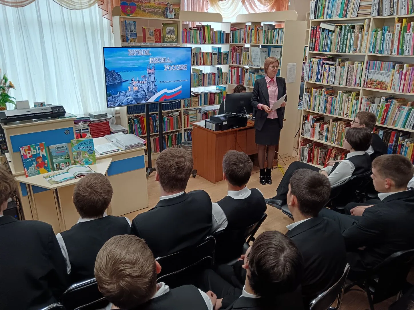 В преддверии двенадцатой годовщины со дня воссоединения Крыма с Россией Белоглинскую поселенческую детскую библиотеку посетили учащиеся 9В класса СОШ № 9. В ходе исторического путешествия "Крым. Весна. Россия" ребята познакомились с основными вехами в развитии полуострова. Большой интерес у присутствующих вызвала информация о творческих людях, в разное время вдохновлённых восхитительной природой и бурной историей Крыма. Не обошлось без знакомства с достопримечательностями.